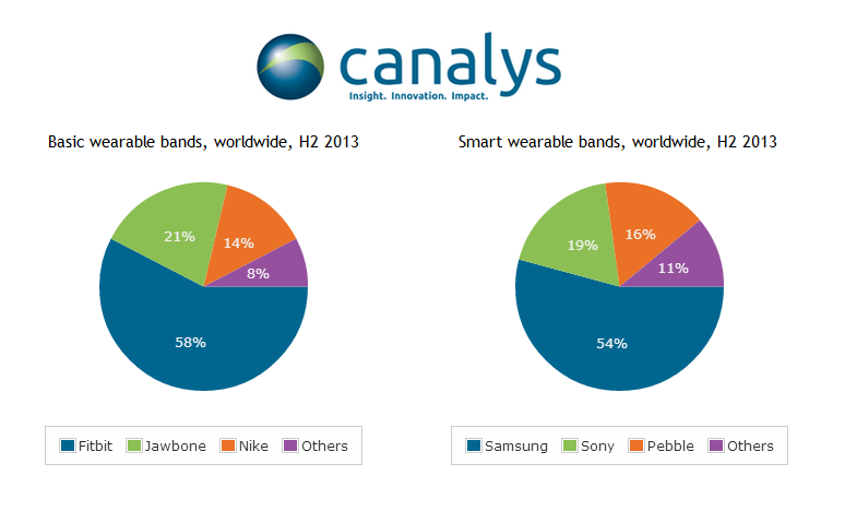 Аналитики сообщили, что поставки двух групп носимых устройств – Fitbit и группы устройств, которые используют в качестве одного из предметов одежды (например, SmartWatch, «умные часы»), выросли во второй половине прошлого года. Fitbit оказался лидером продаж. Это устройство занимало лидирующие позиции на рынке в качестве базовой группы (basic bands), по оценкам Canalys, а это 50% рынка уже во второй половине года. Jawbone занимает вторую позицию по популярности в этом сегменте (приблизительно пятую часть рынка). Затем следует компания Nike с ее FuelBand.
