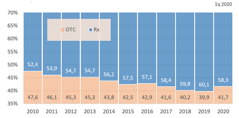 Изменения долевого вклада (%) рецептурных (Rx) и безрецептурных (OTC) лекарственных средств на протяжении 2010 - 1q 2020 годов. Для улучшения наглядности тренда минимальные и максимальные значения оси Y масштабированы.