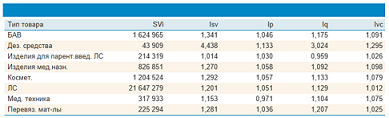 Объемы продаж (SVi) некоторых товарных групп в первом квартале 2020 г. Базовый период - первый квартал 2019 г.; Isv - индекс товарооборота; Ip - индекс цены; Iq - индекс спроса; Ivc - индекс переменного состава.