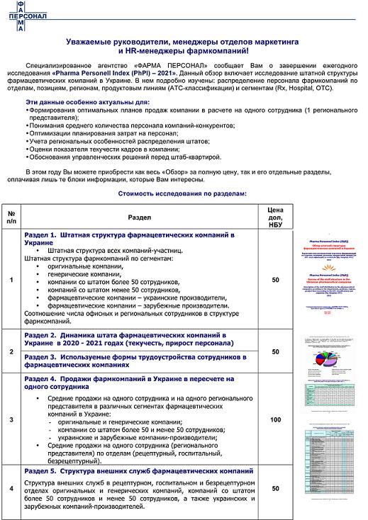 Специализированное агентство «ФАРМА ПЕРСОНАЛ» сообщает Вам о завершении ежегодного исследования «Pharma Personell Index (PhPI) – 2021». Данный обзор включает исследование штатной структуры фармацевтических компаний в Украине. В нем подробно изучены: распределение персонала фармкомпаний по отделам, позициям, регионам, продуктовым линиям (АТС-классификации) и сегментам (Rx, Hospital, OTC).