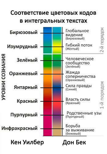 Начнём с того, что при издании книги слово «teal» было переведено без согласования с общепринятой терминологией в русскоязычном интегральном сообществе, от чего возникла путаница. Она, эта путаница и без того присутствует, поскольку и Кен Уилбер, и Дон Бек используют для обозначения стадий развёртывания сложности человеческих систем разные цвета. История возникновения этой путаницы не интересна. В сущности, конечно, не так уж важно, каким символом наделять столь объёмные мыслительные конструкции, если вы понимаете, и цените то, что стоит за символом, больше, чем сам этот символ. Но разногласия всё равно возникают. Вот иллюстрация, призванная минимизировать смысловые потери: