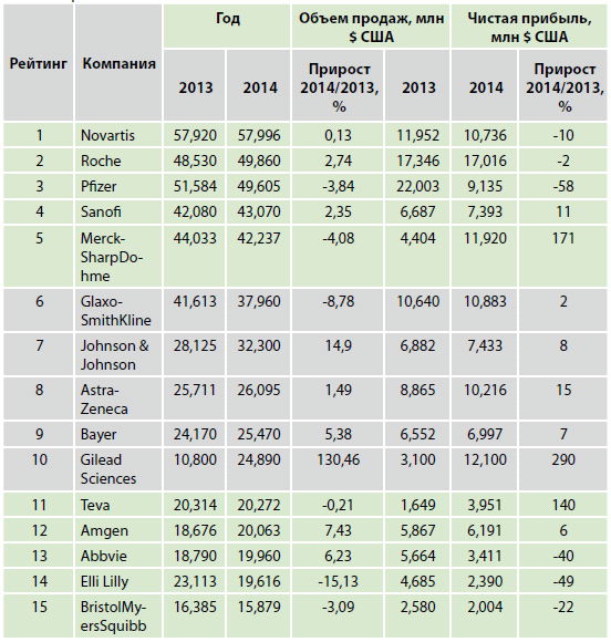 Таблица 2. Рейтинг ТОП-15 мировых фармкомпаний по объему продаж и чистой прибыли в 2014 году