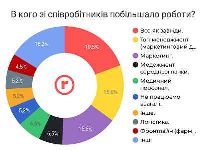 Саме такі варіанти відповіді обрали по 15,6% респондентів. Водночас майже в 20% фармацевтичних компаній обсяги роботи лишилися «докарантинними». Також у деяких компаніях побільшало роботи для менеджерів середньої ланки, медичного персоналу, логістів, фронтлайну.