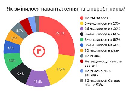 Ще в чверті воно значно зменшилося (на 40-80%). Приблизно в кожній п'ятій компанії навантаження скоротилося на 20%. Водночас більш ніж 16% респондентів вказали, що навантаження значно зросло (до 50% чи навіть у рази).