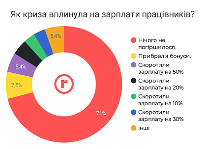Таких 71%. Водночас у інших компаніях довелося зменшити фінансову винагороду працівників: або відмовитися від виплати бонусів, або скоротити зарплати (на 10-50%).
