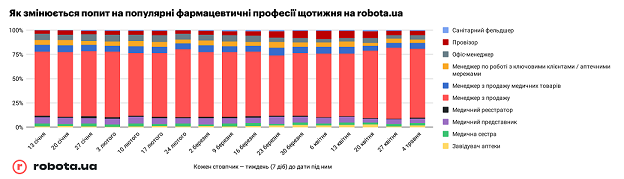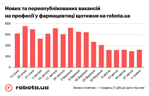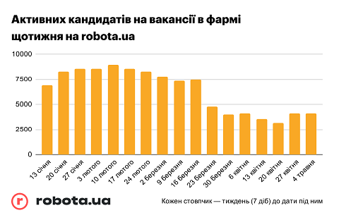Кандидати зменшили активність на 50%, роботодавці — на 55%, однак знову набирають оберти У загальній масі нових актуальних вакансій ми спостерігаємо збільшення попиту на менеджерів з продажу, однак зменшення на всіх інших. Доля фарма-вакансій серед усіх на robota.ua зменшилася — цей ринок значно постраждав.
