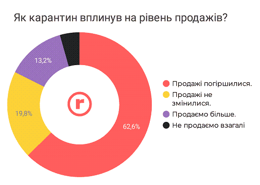 Погіршилися продажі у 75% великих компаній, 12,5% таких організацій продають в період карантину більше. У 23,1% малих компаній продажі не змінилися. Така ж ситуація у 20% компаній із чисельністю персоналу до 100 працівників.
