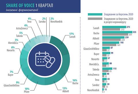 Іноземні компанії також згенерували понад 3000 згадок та отримали 3,25 млн контактів. Тут лідирують Sаnofi, Roche та Abbott. Roche суттєво збільшив свою активність у порівнянні з минулим роком, інші лідери піарились у першому кварталі 2019 приблизно з тією ж кількістю згадок.