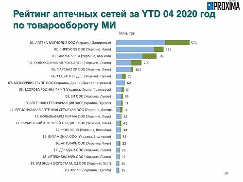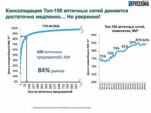 Что касается аптечных учреждений, то докладчик констатировал: количество аптечных точек в последнее время несколько сократилось (хотя и не существенно). Сегодня в Украине реализацию лекарственных средств и парафармацевтики осуществляют 19 688 точек. Консолидация в этом сегменте продолжается и на сегодняшний день 84% рынка в контексте медицинских изделий занимают 100 аптечных учреждений.