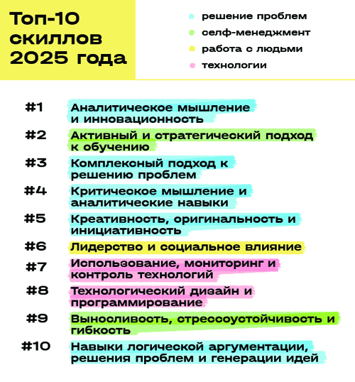 Хард-скиллы, связанные с технологиями и программированием, занимают всего два пункта в рейтинге. Все остальное — «мягкие» навыки. Критическое мышление, аналитические способности и готовность решать проблемы входят в топ-10 уже несколько лет подряд. А навыки самоуправления, такие как активное обучение, гибкость и стрессоустойчивость, в этом году попали в него впервые — это связано с распространением удаленной работы и нестабильной ситуацией в мире.