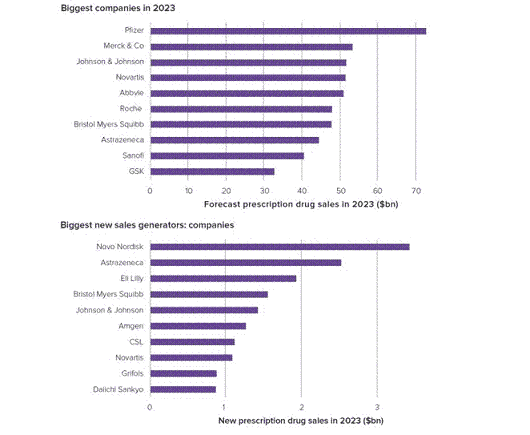 Компанії, які можуть похвалитися найбільшим сукупним доходом від продажу нових ліків у 2023 році, включають Novo Nordisk та Eli Lilly, а вони поки що навіть не входять до загальної десятки. Насамперед ці дві компанії виграють від високого попиту на препарати для лікування цукрового діабету 2 типу та ожиріння – Ozempic, Wegovy та Mounjaro – які встигли стати хітами одразу після ланчів.