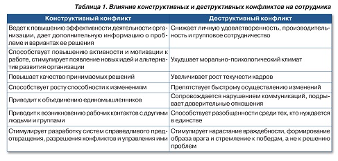 В таблице 1 отображены результаты влияния на организацию конструктивных и деструктивных конфликтов.