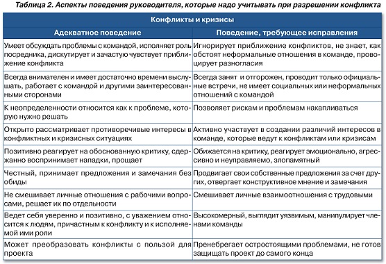 В таблице 2 представлены основные аспекты поведения руководителя (желательные и нежелательные), которые следует учесть при разрешении конфликта в команде.