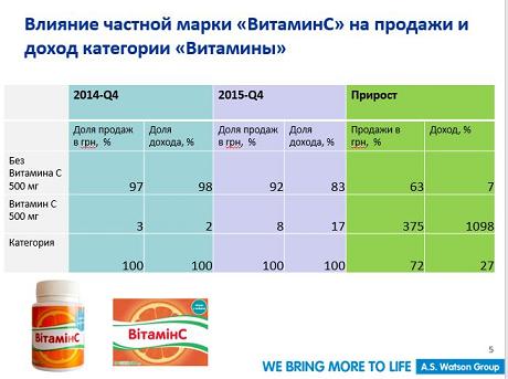 Как работают в аптеках Watsons с собственными торговыми марками, Константин Дегтярев показал на примере частной марки «ВитаминС». По итогам IV квартала 2015 года ее доля в продажах в категории «Витамины» составила 8%, в доходе — 17%. Благодаря «ВитаминС» доход всей категории вырос на 27% по отношению к аналогичному периоду 2014 года. Если бы в компании не ввели новую марку, то рост дохода был бы 7%.