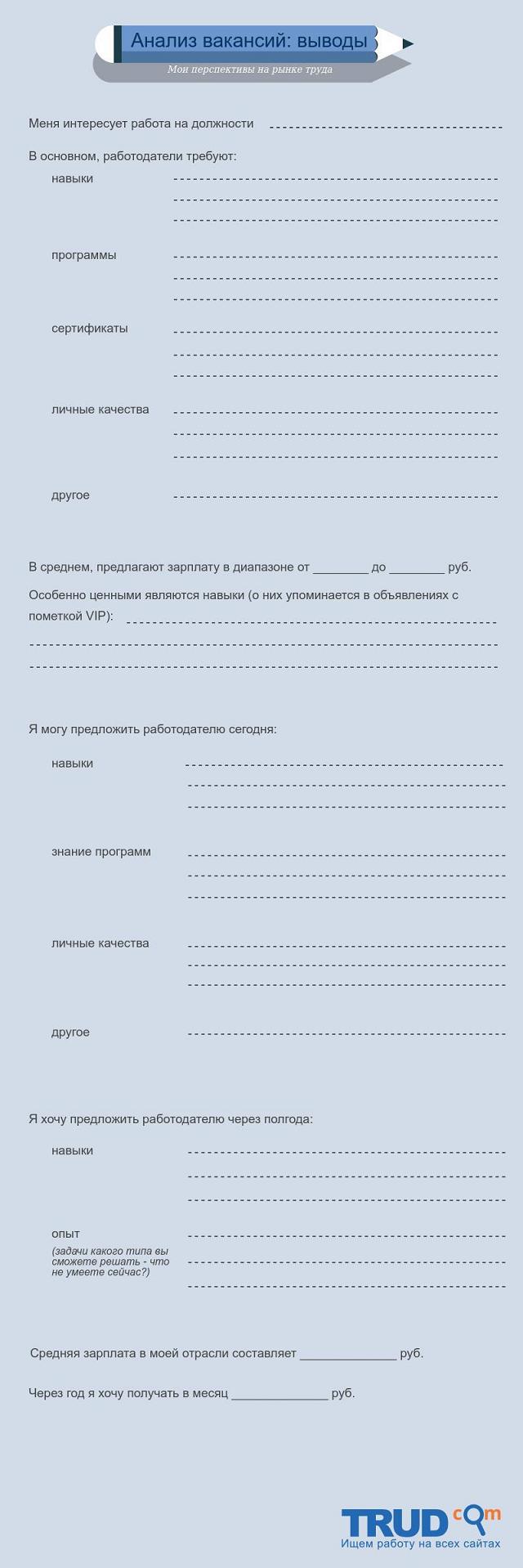 Чтобы вы не занимались исследовательской работой с пустыми руками, мы подготовили для вас «Бланк подведения итогов». Вы можете распечатать бланк, в течение месяца просматривать вакансии, делая в нем пометки. Через месяц оцените сведения, которые вы собрали, и сделайте выводы.