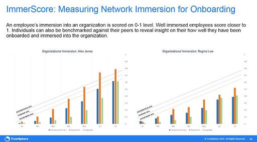 В корпоративном мире наблюдается сумасшедший рост ONA. По мере того, как организации становятся более плоскими, а работа между отделами всё более взаимосвязана, руководители стремятся внедрять инновации, хотят понимать то, как команды работают, уметь выявлять лидеров и находить пути для улучшения продаж, сервиса и производительности. Например, одна компания выяснила, что команды продаж, которые имеют более иерархичную структуру (руководство вовлечено во все сделки) – менее эффективны по сравнению с теми, кто наделен полномочиями. В результате, компания изменила структуру управления. Инструмент Microsoft “MyAnalytics” способен предоставить вам персональные рекомендации по продуктивности (например, вы проводите на встречах на 25% больше времени, чем ваши коллеги и т.д.). Это поможет использовать ваше время более эффективно. Другая компания рассказала мне, что их ONA-исследование показало, что у самых эффективных инженеров гораздо больше встреч и взаимосвязей, чем у других. Это привело к тому, что HR-команда переоборудовала здание для инженеров и перенесла столовую. Это заставило инженеров больше ходить и встречаться с другими коллегами из компании. Поставщики ONA изучают возможности по использованию данных разными интересными способами. Один из них, Trustsphere, может продвинуться до способности определения уровня доверия (как много людей рекомендует или слушает данного человека), влияния (как быстро люди отвечают человеку), сотрудничества (как много трафика в рамках команды) и вовлеченности (как человек общается по сравнению с другими в компании). Перечисленные возможности анализа основаны на метаданных. Но если вы добавите настроение и тон писем, то эти продукты могут стать очень ценными системами восприятия того, как работает организация. Обратите внимание, нижеследующий анализ демонстрирует, как один из сотрудников адаптируется гораздо быстрее по сравнению с остальными, а другой – сильно отстает.