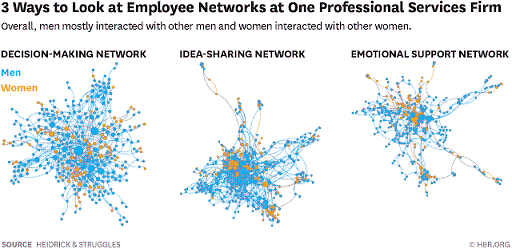 ONA – это направление в аналитике, позволяющее консультантам распознавать отношения и взаимосвязи (“кто с кем общается”), с целью понимания того, как работает организация. Инструментами ONA являются опросы, системы, отслеживающие email-трафик, и более сложные приложения, которые учитывают все способы связи (электронная почта, текстовые сообщения, обратная связь, разговоры).Существуют сотни инструментов, способных сделать ONA-анализ, и консалтинговых фирм, как Deloitte, McKinsey и другие, которые в этом эксперты. Благодаря множеству продуктов, представленных на рынке сегодня (Microsoft Workplace Analytics, Trustsphere, Keencorp, Yva.ai и т.д.) вы можете сделать это самостоятельно. Дисциплина изучалась на протяжении многих лет и большинство таких социальных сетей, как LinkedIn, Facebook, Twitter и New York Times проводят ONA c целью понимания, как схожие между собой группы общаются, группируются и выглядят относительно друг друга. Ниже результат анализа ONA по изучению влияния гендерного фактора на принятие решений. Как вы можете видеть, женщины менее вовлечены в принятие стратегический решений, но активно участвуют в обмене идеями и эмоциональной поддержке. (Вот так сюрприз!)