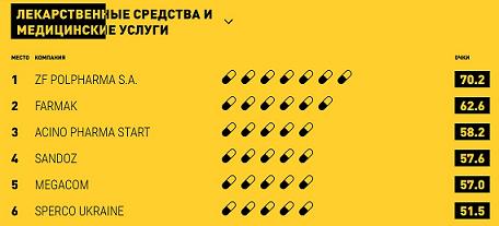 В категорию «Лекарственные средства и медицинские услуги» вошли 6 фармацевтических компаний – как отечественных, так и иностранных. Возглавила рейтинг компания ZF POLPHARMA S.A. Ниже расположились фармпроизводители Фармак, ACINO PHARMA START, Sandoz, Мегаком и Сперко.