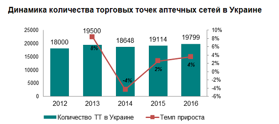 В 2014-2016 годах наблюдалось укрупнение розничных аптечных компаний, которое коснулось в основном сферы больших игроков рынка, таких как «Аптека низких цен», «Бажаємо здоров’я», «Доброго дня». Данные сети состоят из 50 и более торговых точек. За указанный период они продемонстрировали рост на уровне 4%. В то время как рост доли одиночных торговых точек составил менее 1%.