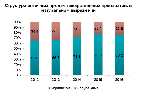 В 2016 году средняя стоимость 1 упаковки лекарственного средства продолжала постепенно увеличиваться. Так, в 2016 году стоимость 1 упаковки лекарства, произведенной украинской компанией, составляла 23,4 грн, что на 18,5% больше, чем в 2015 году (в этом периоде рост составлял 40,5%). Стоимость 1 упаковки препарата, произведенной иностранной компанией, в 5 раз превышала цену отечественного аналога и составляла 116 грн, что на 7,7% больше, чем в 2015 году.